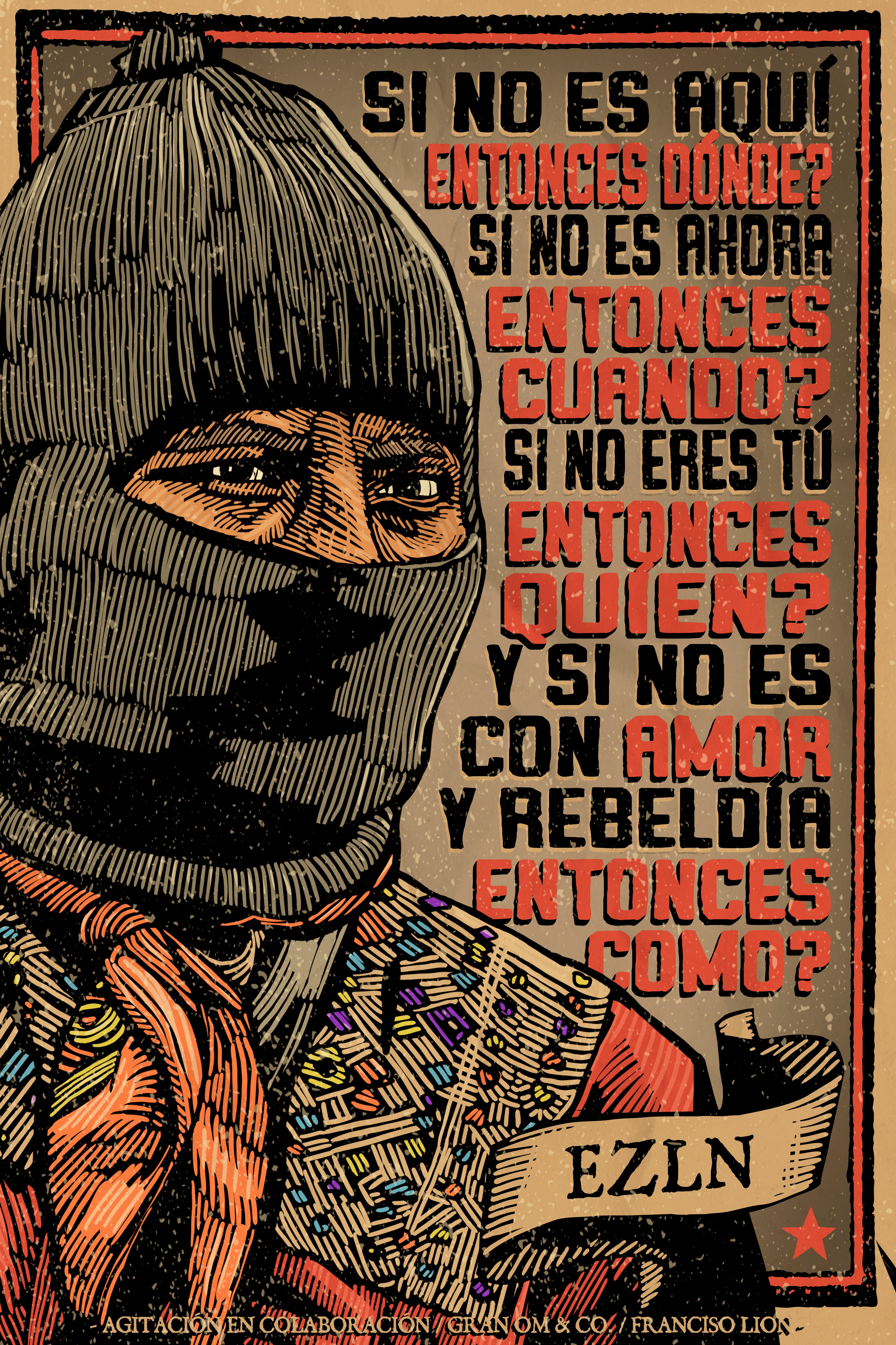 Este cartel hace referencia a la comunidad indígena ubicada en Chiapas, México - EZLN o Zapatista- que busca la autonomía del gobierno Mexicano. En su comunidad existe la práctica de cubrirse la mitad de la cara con un pañuelo, dejando sólo los ojos. Esto se hace para eliminar el protagonismo individual y reforzar aún más su enfoque comunitario colectivo.