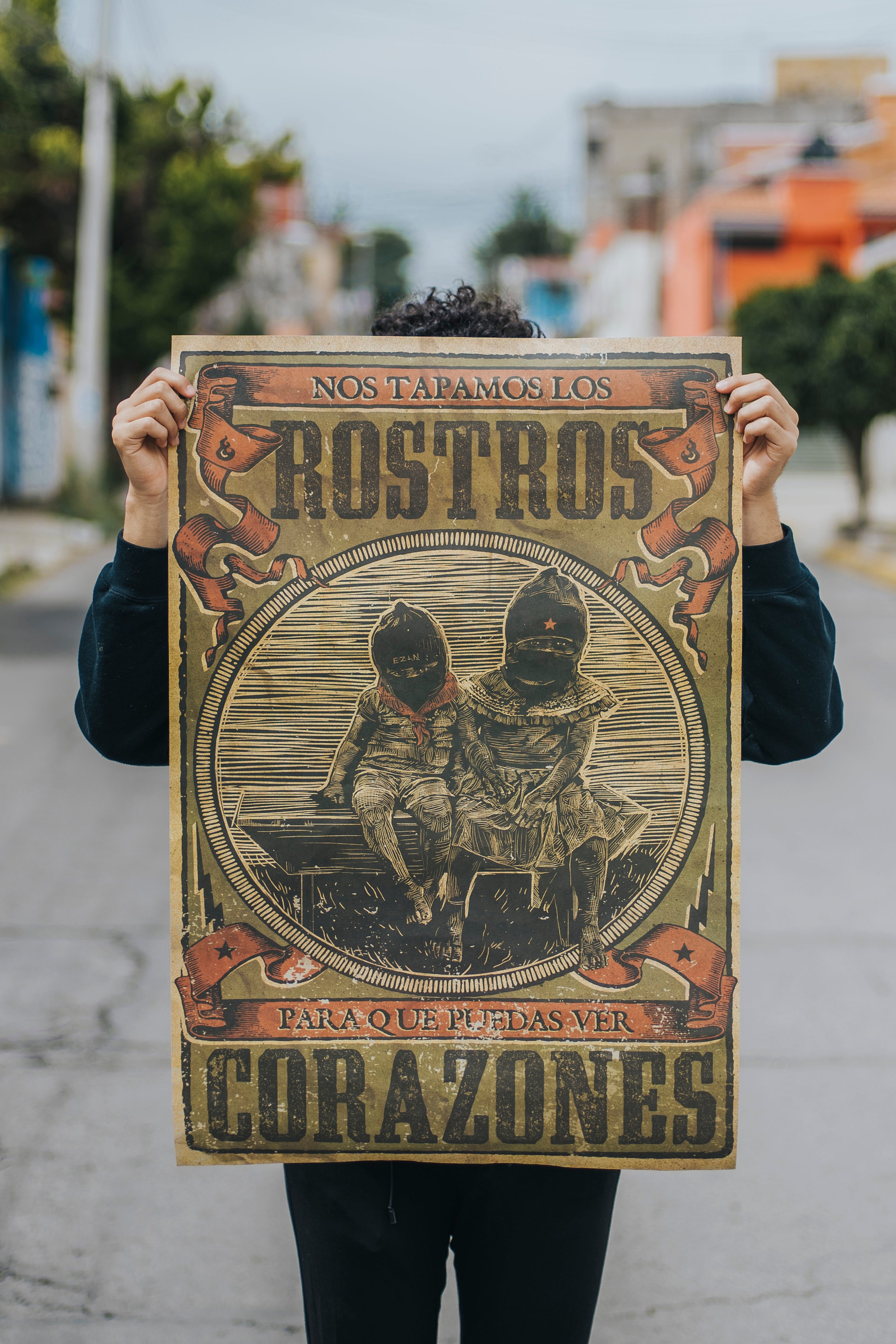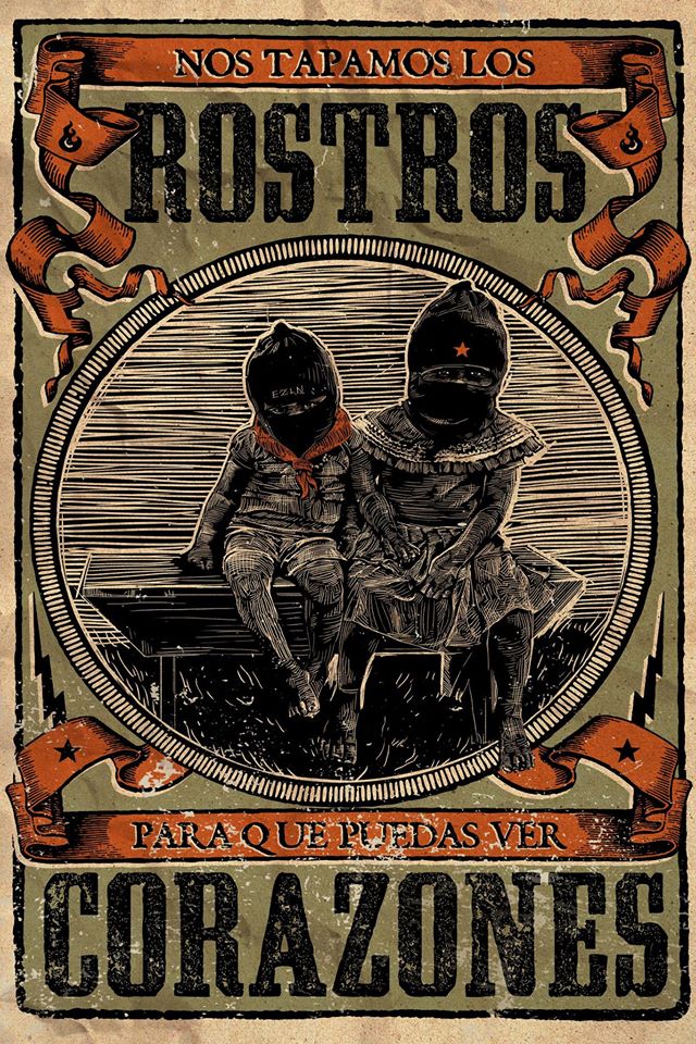 Este cartel hace referencia a la comunidad indígena ubicada en Chiapas, México - EZLN o Zapatista- que busca la autonomía del gobierno Mexicano. En su comunidad existe la práctica de cubrirse la mitad de la cara con un pañuelo, dejando sólo los ojos. Esto se hace para eliminar el protagonismo individual y reforzar aún más su enfoque comunitario colectivo.