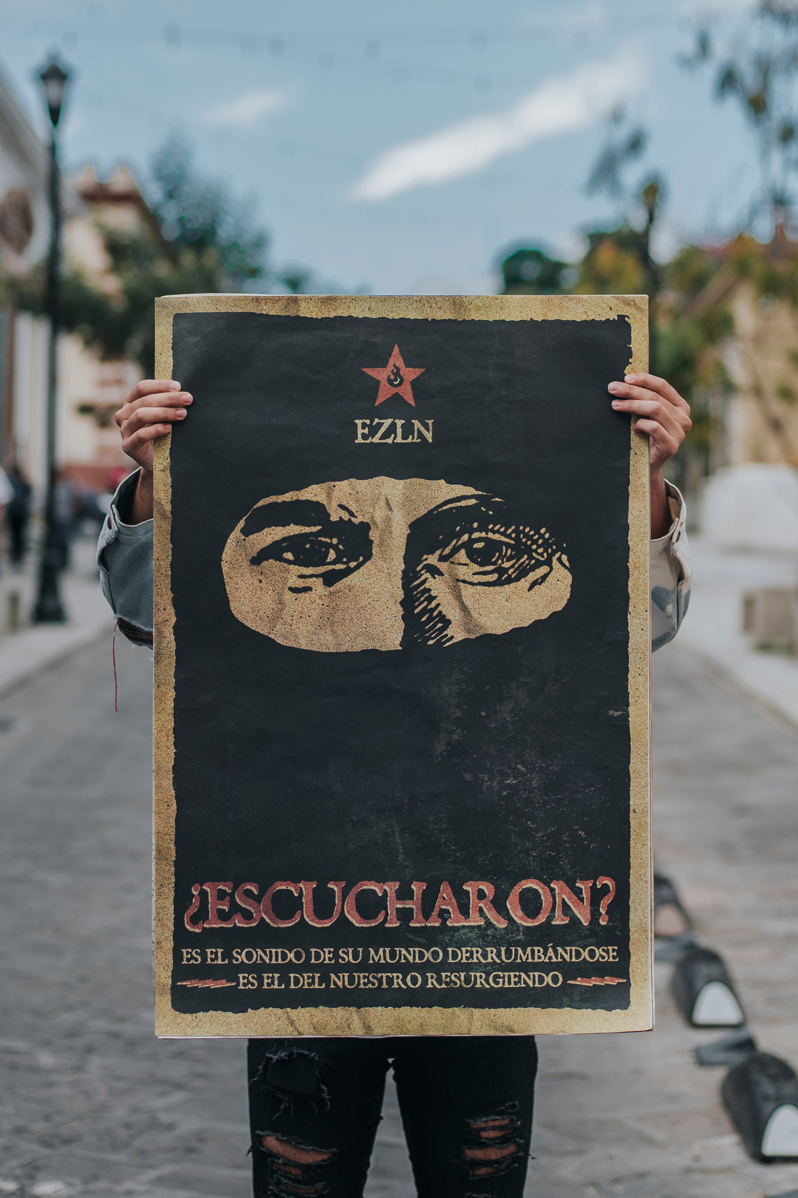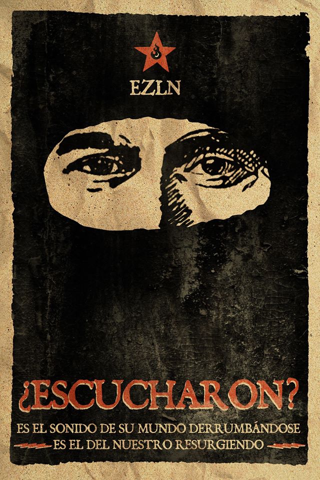 Este cartel hace referencia a la comunidad indígena ubicada en Chiapas, México - EZLN o Zapatista- que busca la autonomía del gobierno Mexicano. En su comunidad existe la práctica de cubrirse la mitad de la cara con un pañuelo, dejando sólo los ojos. Esto se hace para eliminar el protagonismo individual y reforzar aún más su enfoque comunitario colectivo.